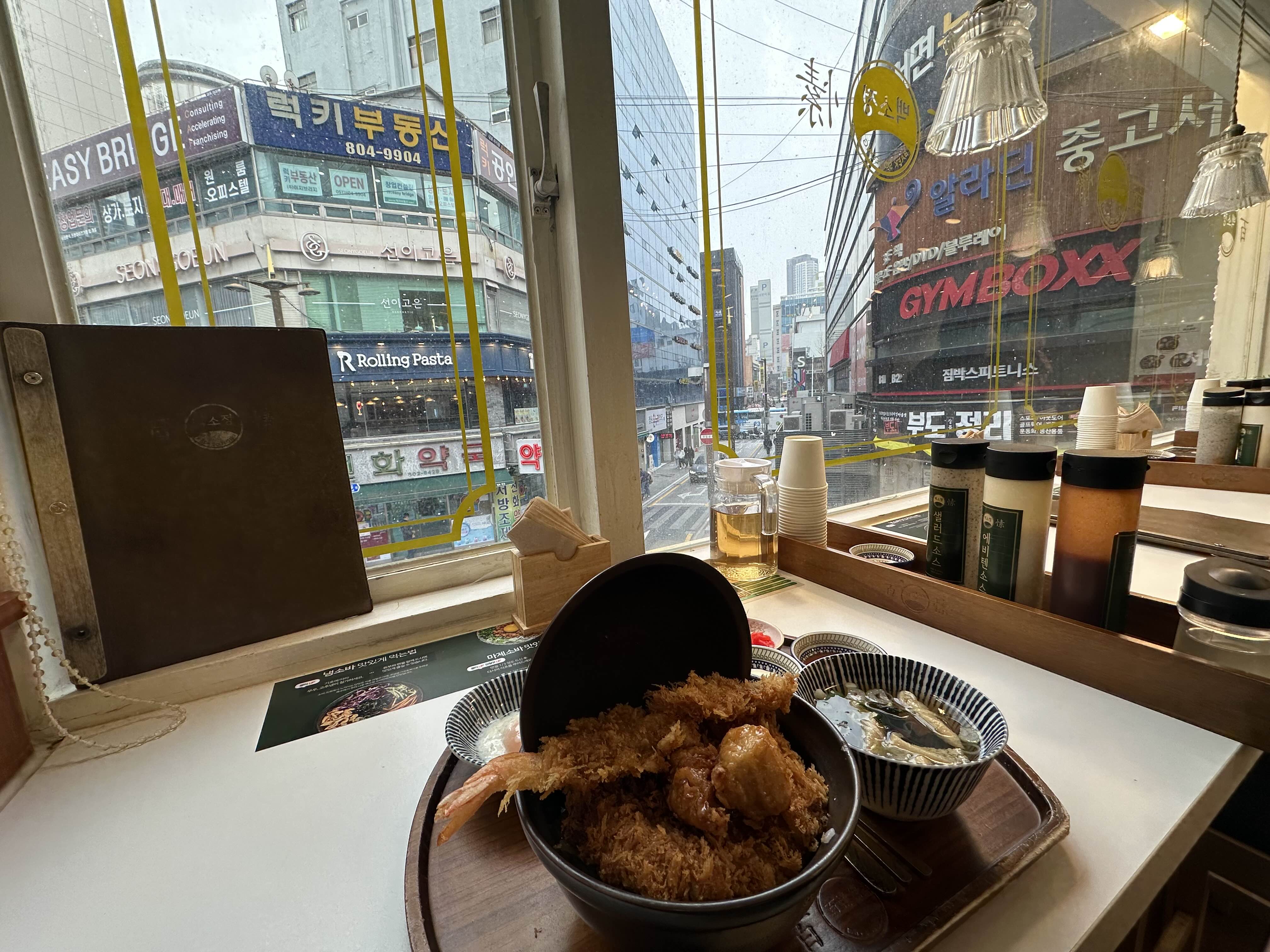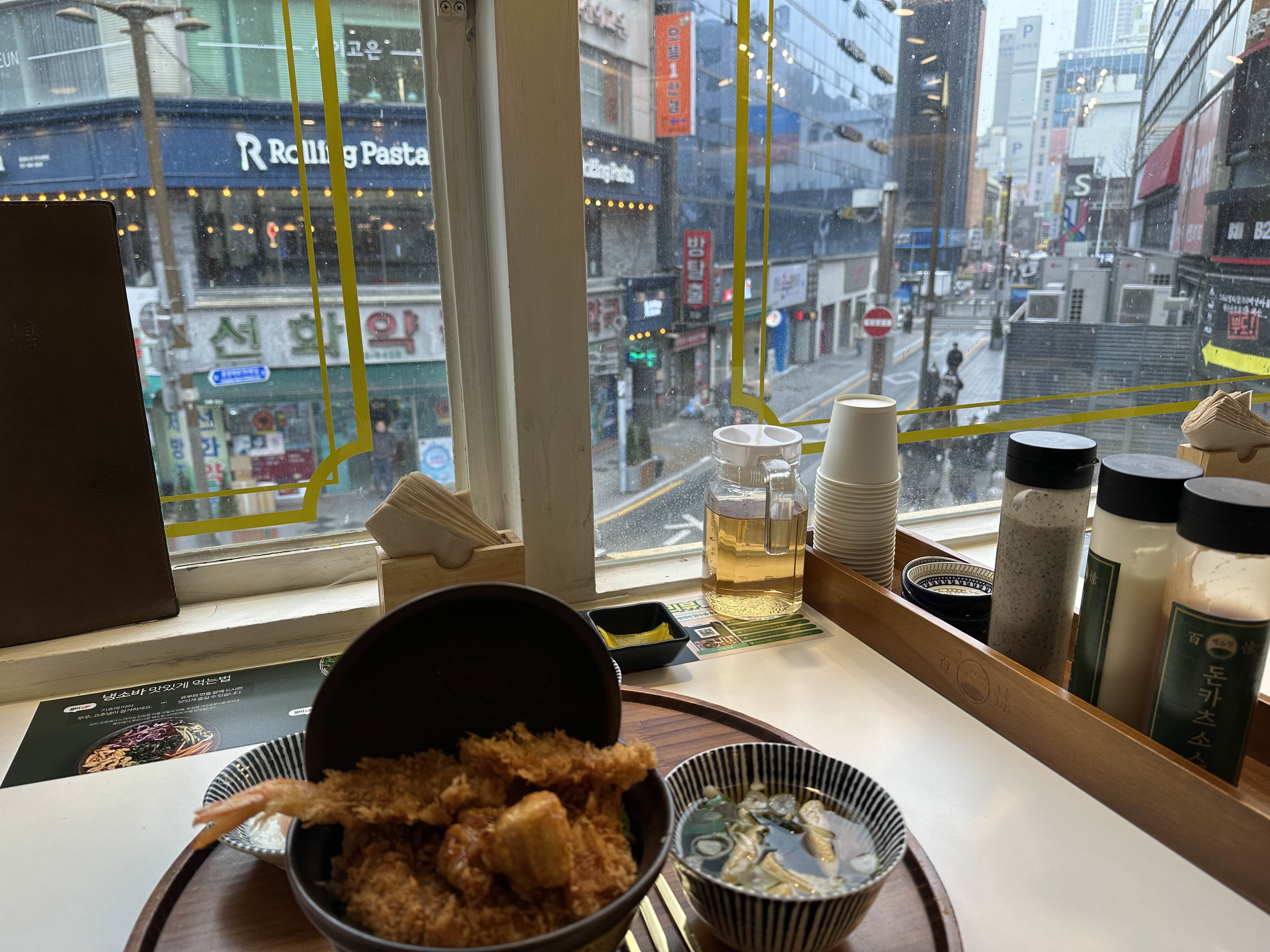 돈카츠, 새우튀김1개, 가라아게, 온센타마고(온천달걀), 소우동, 샐러드, 연유치즈떡